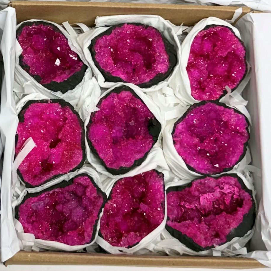 - Packaging: Flat of dyed Moroccan geode halves, sold by the box