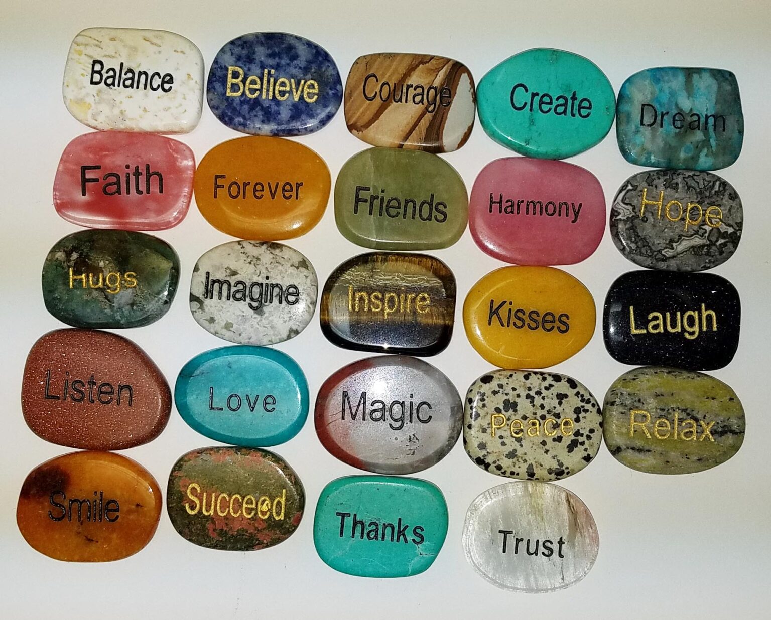 Word Stones are similar to Spirit Stones except they have words carved into the gemstones. Approximate size is 1 1/2 inches. Like Spirit Stones we cannot honor requests for specific types of stones.